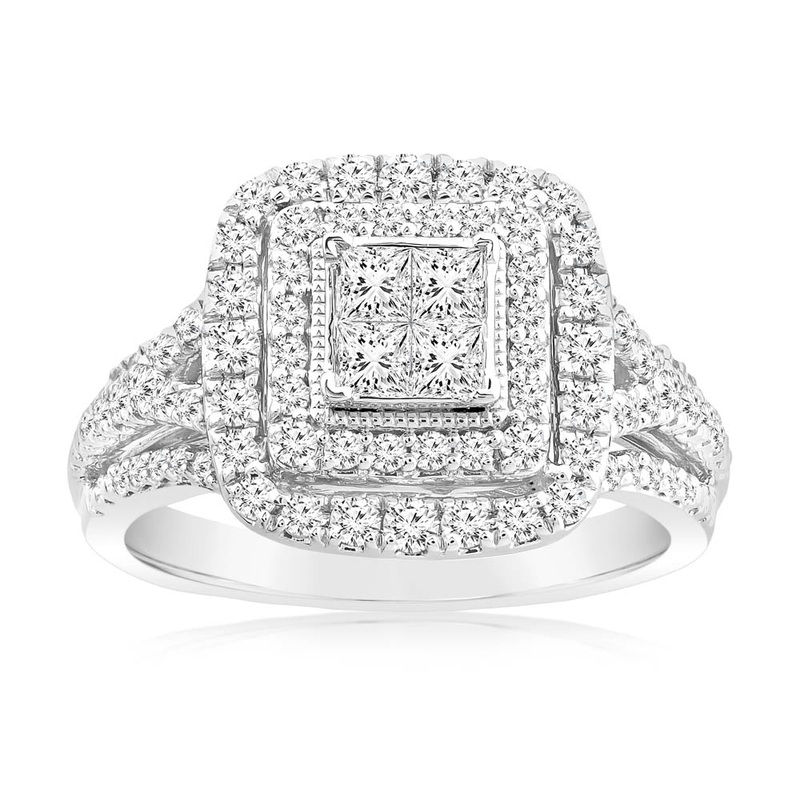 Luxurious and eye-catching, this 0.95 Carat Diamond Cushion Cluster Ring in 14ct White Gold is designed to dazzle. Featuring a cushion shaped cluster of brilliant diamonds totalling 0.95 carat, this ring delivers incredible sparkle and dimension. Set in gl