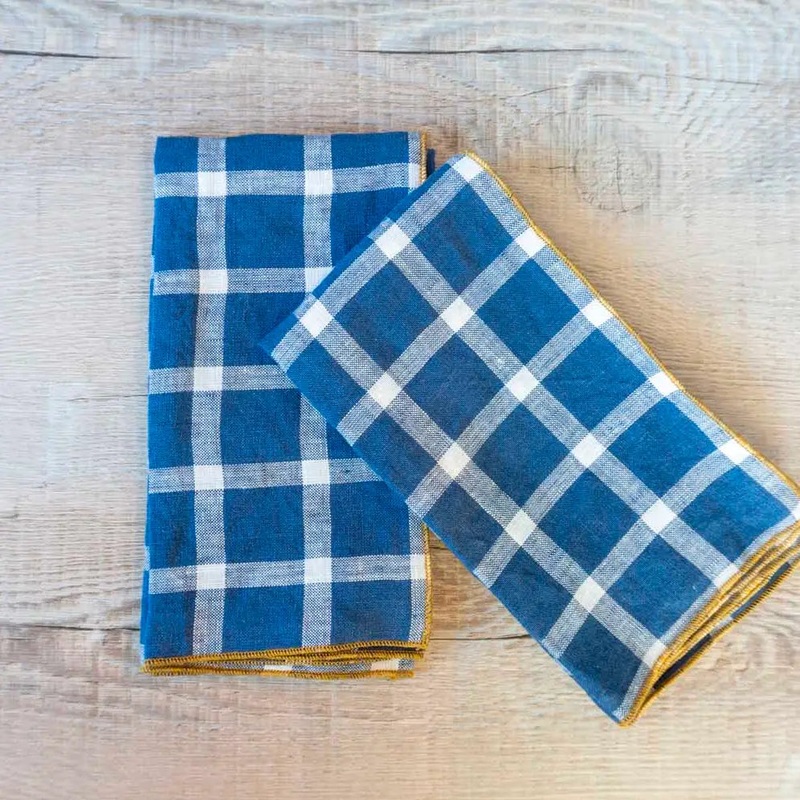 PACKAGE OF TWO BLUE CHECK LINEN NAPKINS WITH EMBROIDERED EDGE Sure to please, these cloth dinner napkins are made with a softened YARN-DYED linen with a
