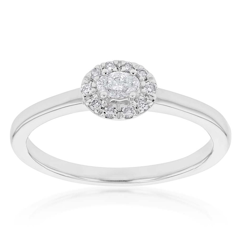 Modern 10ct White Gold Oval cut with 1/6 Carat Diamond Solitaire with Diamond Halo is a beautiful ring for all occassions.