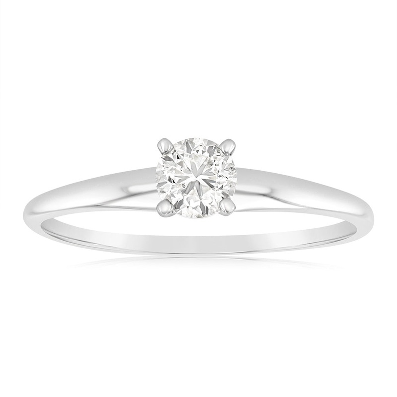 A beautiful piece, this 14ct White Gold Solitaire Ring With 50 Point Brilliant Cut Diamond is unmissable. A perfect engagement ring, spoil a special person in your life with a ring that they will treasure for a lifetime. The band is crafted in sleek 14ct white gold that is shiny with a smooth lustre that exudes luxury. A solitaire setting accentuates the properties of the diamond, and the 50 point diamond really dazzles in this ring.