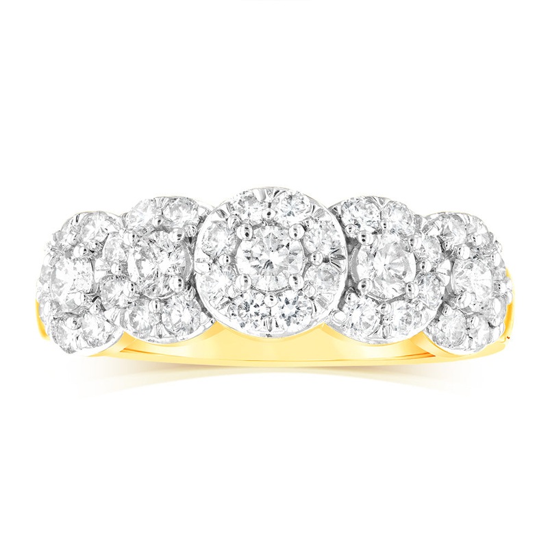 14ct Yellow Gold 0.95 Carat Diamond Ring with 5 Round Brilliant Cut Diamonds Surrounded by Diamond Halos