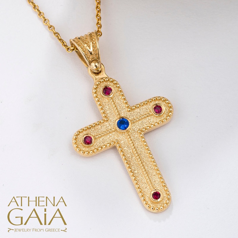 Designed with elements of byzantine design, this 14k gold Western Pomme Cross features a delicate rope border and accents of sapphires and rubies. Perfect for everyday wear or as a meaningful baptism cross. Available in yellow, white, or rose gold.
