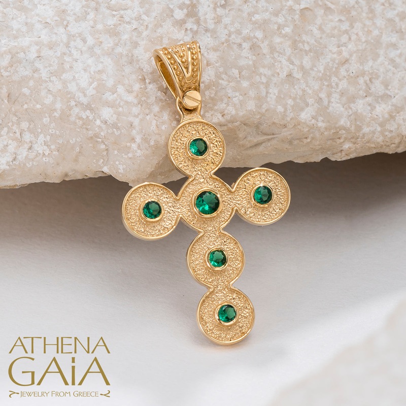 Designed with elements of byzantine design, this 14k gold Western Geometric Cross features stones of your choice (call for options). Perfect for everyday wear or as a meaningful baptism cross. Available in yellow, white, or rose gold.