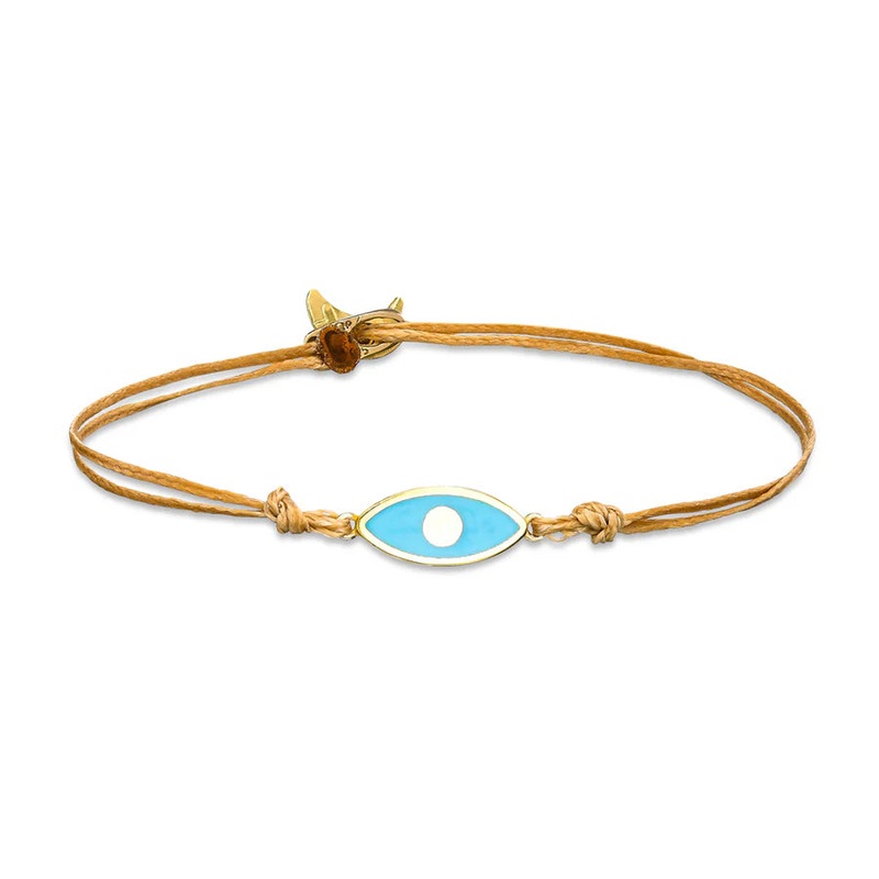 A layer of gold with a vibrant 14K Gold enamel charm, this stackable bracelet offers style and protection with its evil eye connected to cords.