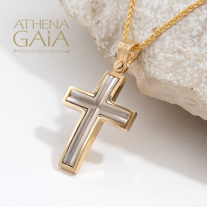 The 14k Gold Two-Toned Inlay Latin Cross features a unique design with a cross within a cross. This elegant and intricately designed piece serves as a beautiful symbol of faith, perfect for everyday wear or as a baptism cross.