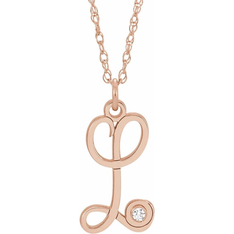 653575 / 14K Rose / L / 16-18 In / Polished / .02 Ct Diamond Accented Script Initial Necklace