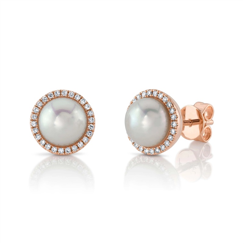 14K Rose Gold Cultured Pearl Stud Earrings with Diamond Halo