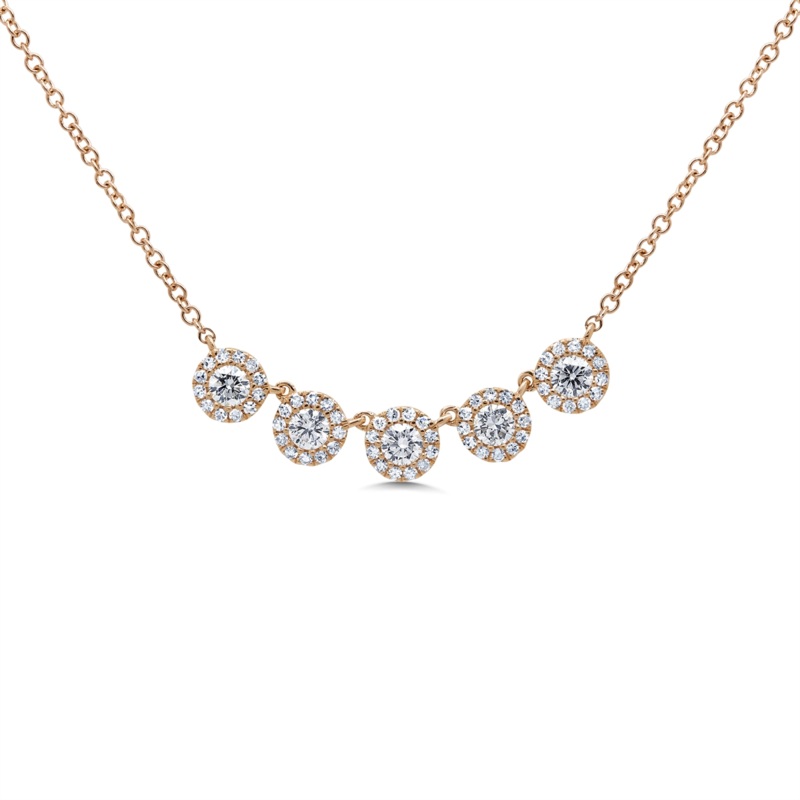 Ladies diamond necklace in 14 karat rose gold. Set in the necklace are 65 round diamonds with a total weight of 0.53 carat, attached chain is 15-18 inch adjustable.