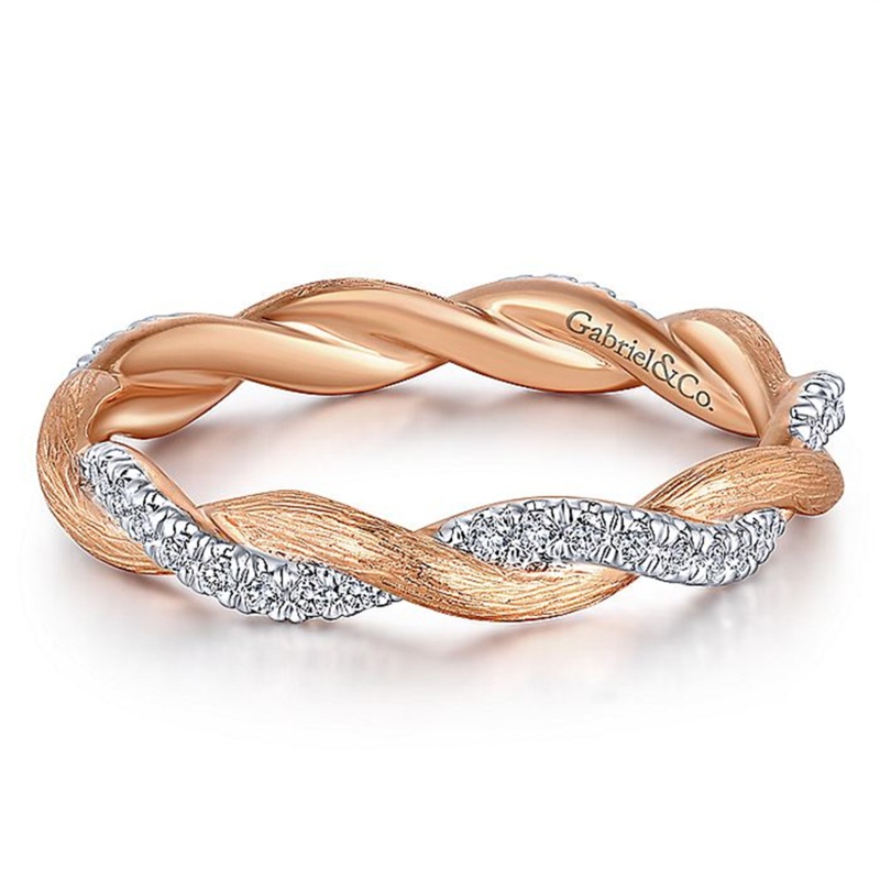Collection: Gabriel & Co. Stackable Style: Twisted Metal: 14K Rose Gold Stones: (45) Round Brilliant Cut Diamonds Total Carat Weight: 0.22 Setting: Split Prong Finger Size: 7 Band Width: 2.90mm (Approximately 1/10 In) Vendor Style No.: LR50886E-7K45JJ