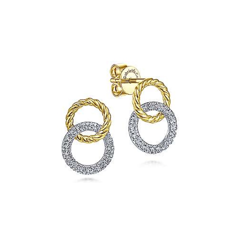 Crafted with intricate care and attention to detail, these 14K Two-Tone 0.23ctw open circle twisted rope and diamond stud earrings are a stunning addition to any jewelry collection. Exuding the essence of luxury, they feature high-quality diamonds set in a beautiful twisted rope circle design that will sparkle elegantly in any light.