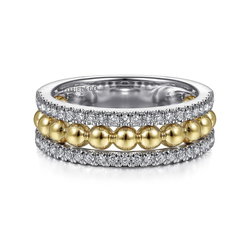 Achieve the appearance of three rings in one with this 0.40ct diamond stunner. Outer rows of twinkling pav diamonds flank a central strand of beaded 14K yellow gold, creating that signature Bujukan look. Mixing metals has never looked so chic.