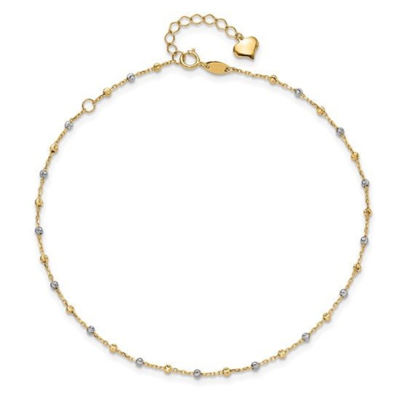 Elevate your style with our 14K Two Tone Gold Diamond Cut Beaded Ankle Bracelet. Made with exquisite craftsmanship, this ankle bracelet features intricate diamond-cut beading for a luxurious touch. Perfect for adding a touch of sophistication to any outfit. Elevate your look with this exclusive piece.