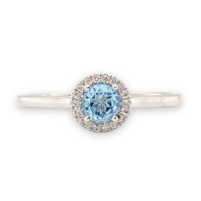 This round blue topaz ring in 14k white gold is designed to allure. The soft blue topaz is held in a classic 4 prong setting and encircled with a glimmering halo of diamonds. 6mm
