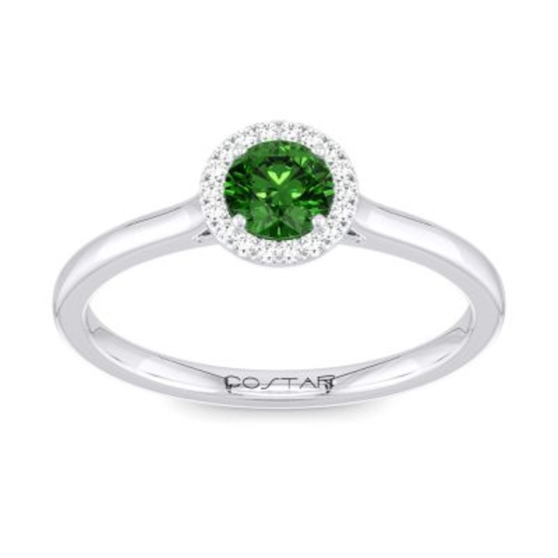 This round emerald ring in 14k white gold is designed to allure. The rich green emerald is held in a classic 4 prong setting and encircled with a glimmering halo of diamonds. 6mm