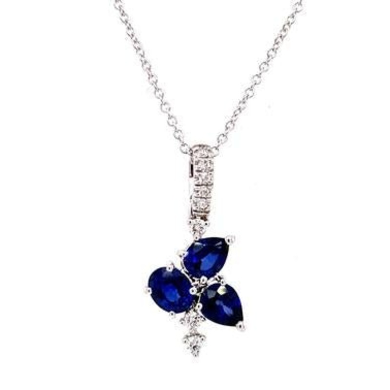 14k White gold fancy diamond and sapphire pendant. Pendant has 8 diamonds totaling .09ctw and 3 sapphires totaling 1.10ctw. The pear and oval shape of the sapphires gives this pendant a unique look.