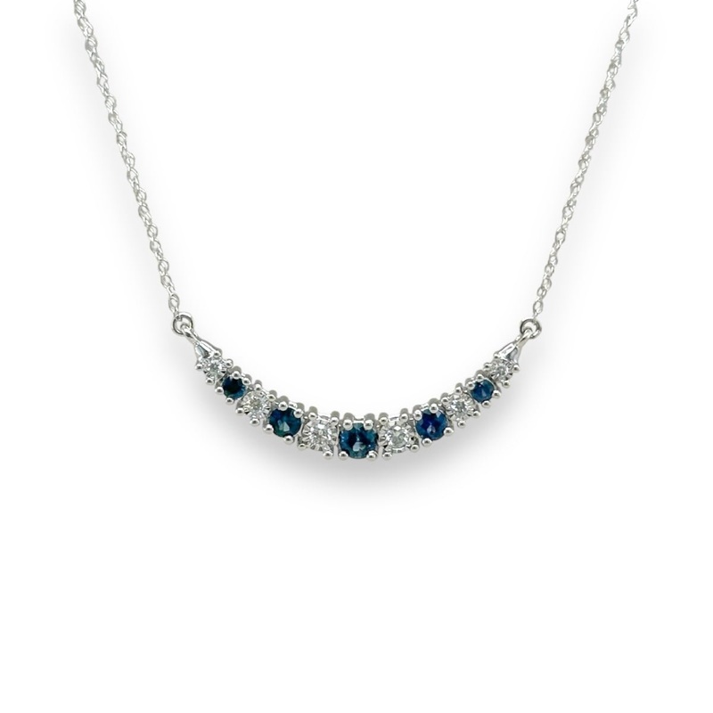 Indulge in the sophistication of our 14K white gold bar necklace. Adorned with 0.10ctw of sparkling diamonds and 0.40ctw of deep blue sapphires, this elegant piece is crafted to perfection. Elevate your style with this exclusive necklace that truly embodies luxury. 18″