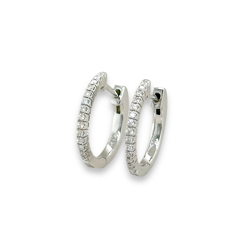 Indulge in luxury with our 14K White Gold Hoop Earrings, adorned with 0.15 carats of sparkling diamonds. Crafted with sophistication and elegance in mind, these earrings are the perfect addition to any outfit. Elevate your style with these exclusive and timeless pieces.
