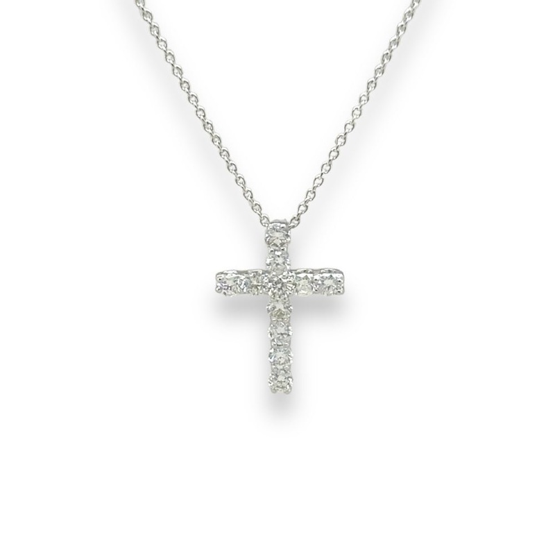 This 14K White Gold Cross features 0.32 carats of shimmering H/SI1 diamonds, hangs from an 18″ cable chain that can be worn in three adjustable lengths. Elevate your style with this delicate and versatile piece, perfect for any occasion.