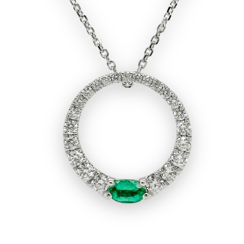 This sophisticated pendant has classic appeal, as a chic open-space circle pendant plays host to a stunning .25ctw oval emerald and .55ctw round brilliant-cut diamonds that sparkle. Its robust gemstone color and refined style will provide the perfect finishing touch to your everyday dress. Crafted in 14kt white gold and hangs from a 16″ cable chain with lobster clasp.