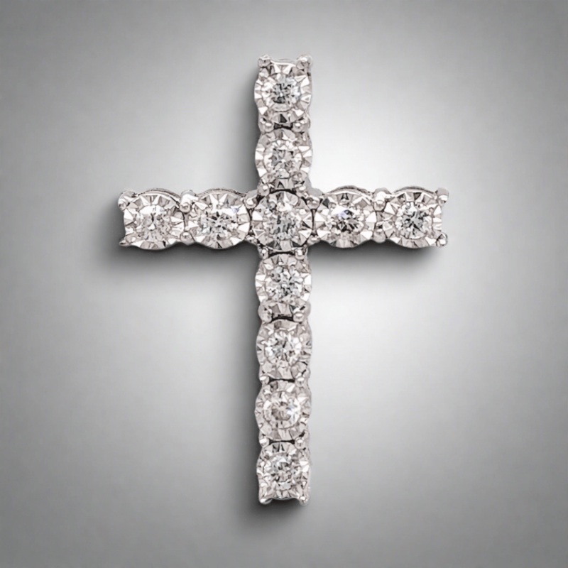 Adorn yourself with this stunning 14K White Gold cross pendant. Glittering with 11 diamonds set within a miracle setting, this exquisite piece is a showstopper with its 0.25cttw Diamonds. Celebrating faith in luxurious style, the 20mm x 15mm pendant is perfect for special occasions.