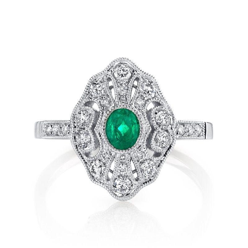 An antique inspired fashion ring with emerald and diamond accent stones, filigree & milgrain detailing. Shown in White Gold. All stones included in the price.