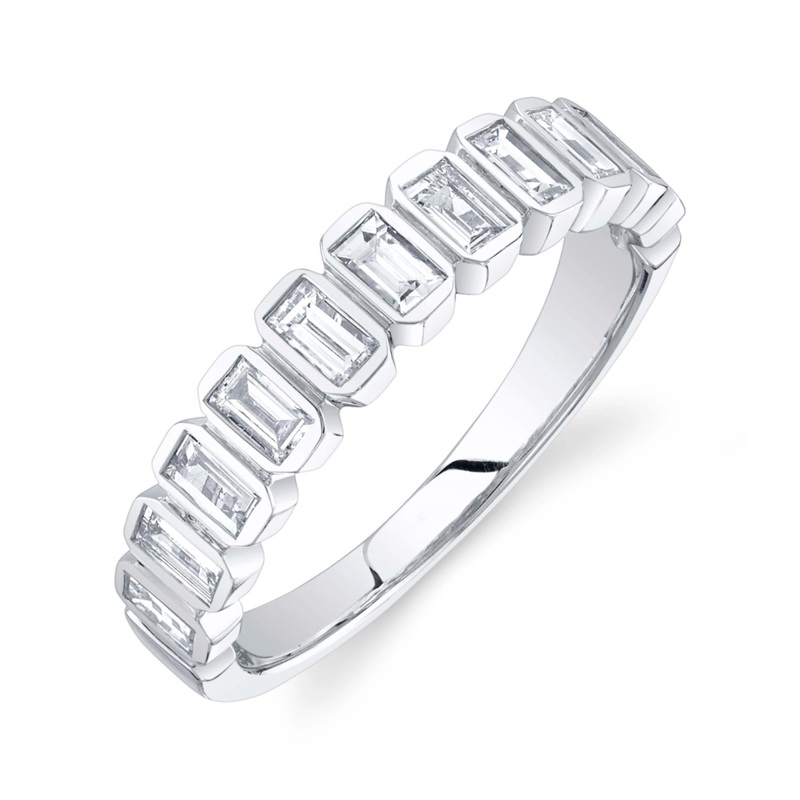 Ladies diamond band in 14 karat white gold. Set in the band are 11 baguette cut diamonds with a total weight of 0.78 carat.