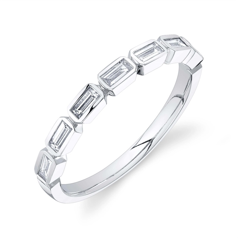 Ladies diamond band in 14 karat white gold. Set in the band are seven baguette cut diamonds with a total weight of 0.35 carat.