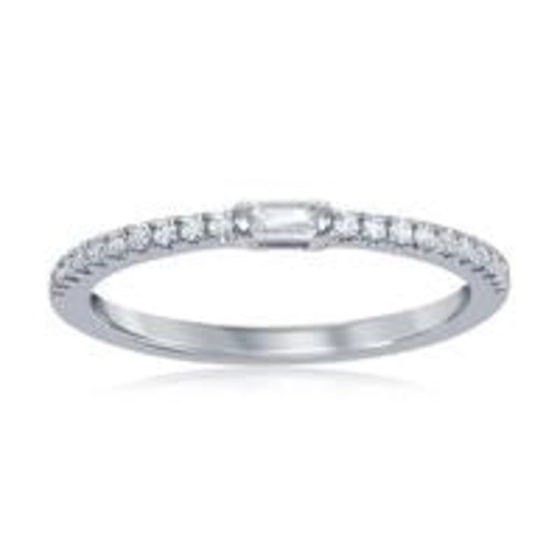 Ladies diamond band in 14 karat white gold. Set in the band is one 0.03 carat baguette cut diamond and 20 round brilliant cut diamonds with a total weight of 0.16 carat.