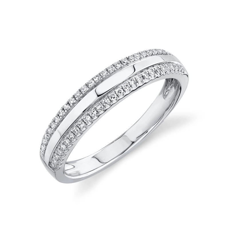 Ladies diamond band in 14 karat white gold. Set in the band are 11 round brilliant cut diamonds with a total weight of 0.43 carat.
