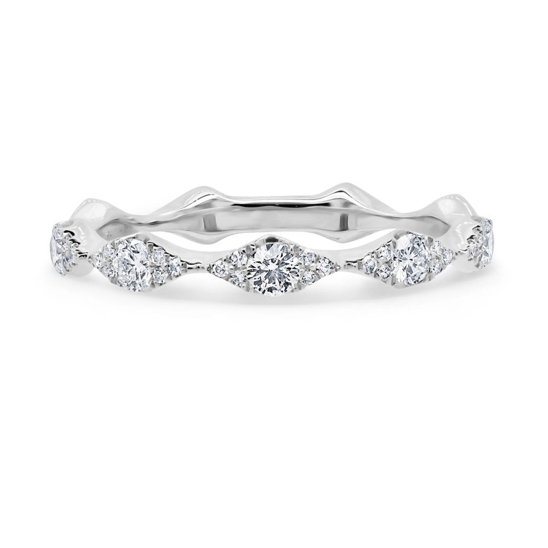 Ladies diamond band in 14 karat white gold. Set in the band are five round brilliant cut diamonds and 30 single cut diamonds with a total weight of 0.38 carat.