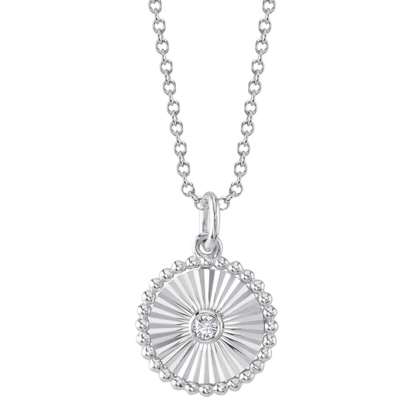 Ladies diamond necklace in 14 karat white gold. Set in the pendant is one 0.02 carat round brilliant cut diamond, on a 15-18 inch adjustable chain.