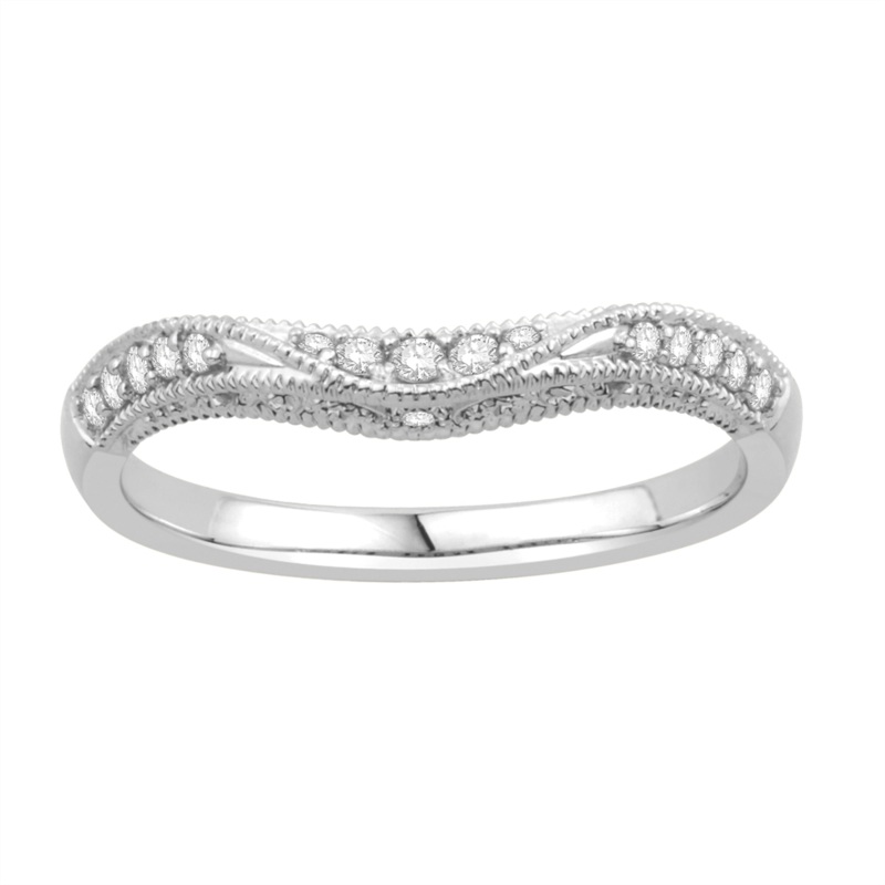 Ladies diamond band in 14 karat white gold. Set in the curved band are 15 round brilliant cut diamonds with a total weight of 0.16 carat.