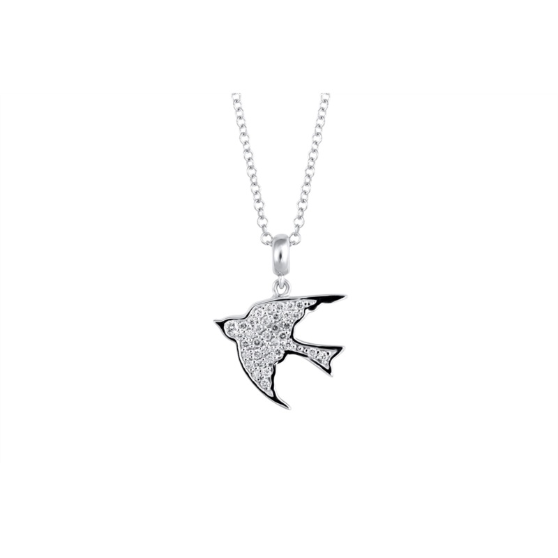 Ladies diamond pendant necklace in 14 karat white gold. Set in the dove pendant are 34 round brilliant cut diamonds with a total weight of 0.13 carat, on a 16-18 inch adjustable chain.
