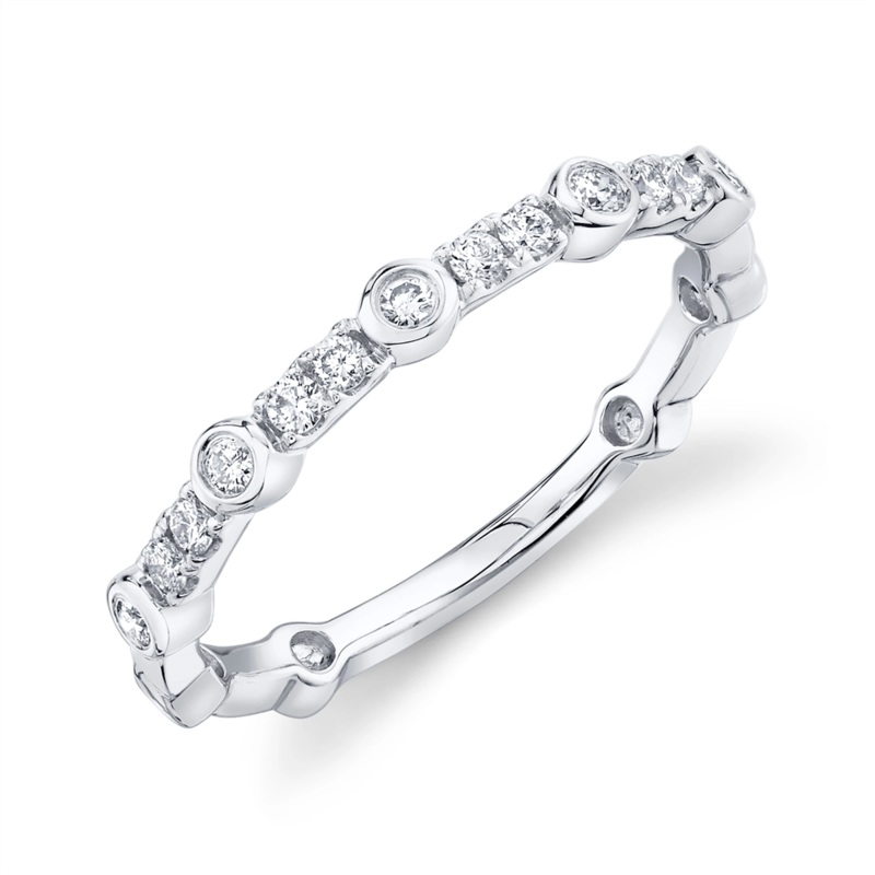 Ladies diamond band in 14 karat white gold. Set in the band are 13 round brilliant cut diamonds with a total weight of 0.21 carat.