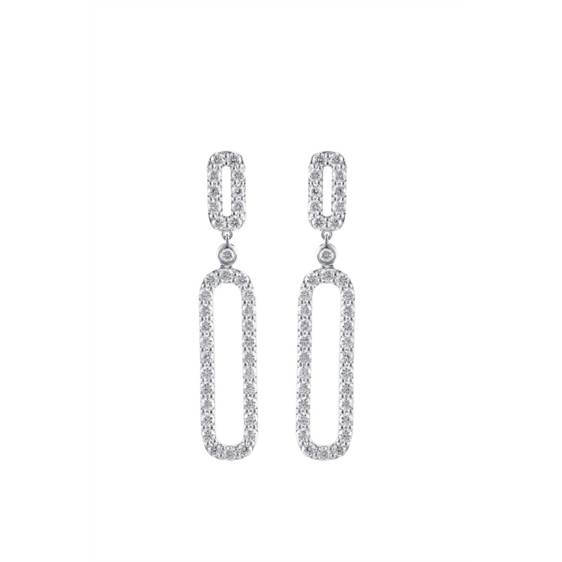 Ladies diamond earrings in 14 karat white gold. Set in the dangle earrings are 74 round brilliant cut diamonds with a total weight of 1.87 carat.