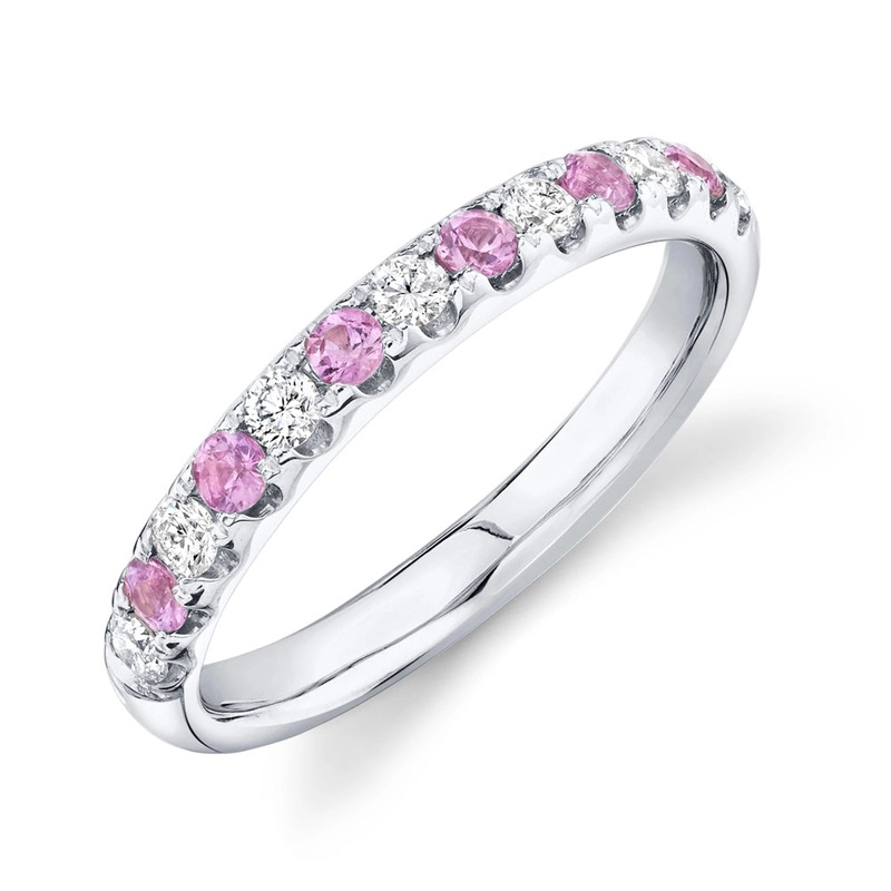 Ladies pink sapphire and diamond band in 14 karat white gold. Set in the band are six round pink sapphires with a total weight of 0.30 carat and seven round brilliant cut diamonds with a total weight of 0.30 carat.