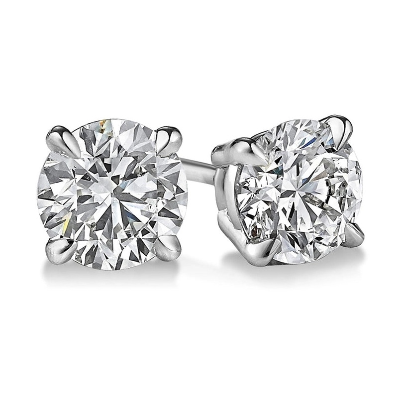 Ladies diamond earrings in 14 karat white gold. Prong set in the stud earrings are two round brilliant cut diamonds with a total weight of 0.73 carat.
