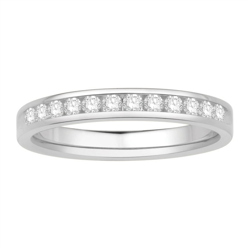 Ladies diamond band in 14 karat white gold. Set in the band are 12 round brilliant cut diamonds with a total weight of 0.75 carat.