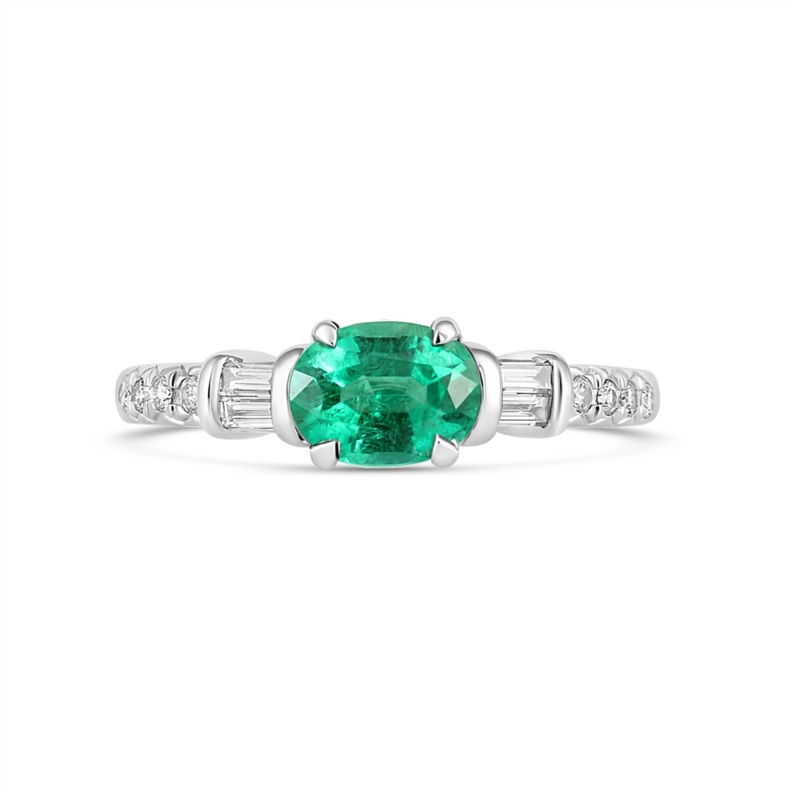 Ladies emerald and diamond ring in 14 karat white gold. Set in the ring is one 0.96 carat emerald and eight round brilliant cut diamonds and four baguette cut diamonds with a total weight of 0.21 carat.