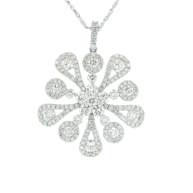 Style: Flower Metal: 14K White Gold Stones: (171) Round Diamonds Total Carat Weight: 2.30Ctw Setting: Prong Vendor Style No.: PK585-2.3W4W*Chain Not Included