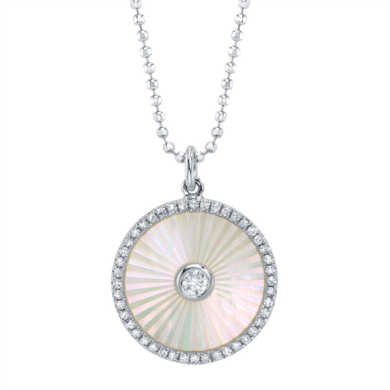 Ladies Mother of Pearl and diamond necklace in 14 karat white gold. Set in the disc pendant is one 1.37 carat ridged Mother of Pearl and one round brilliant cut diamond and 44 single cut diamonds with a total weight of 0.18 carat, on a 15-18 inch adjustable chain.