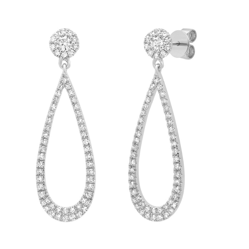 Ladies diamond earrings in 14 karat white gold. Set in the dangle earrings are two round brilliant cut diamonds and 118 single cut diamonds with a total weight of 0.36 carat.