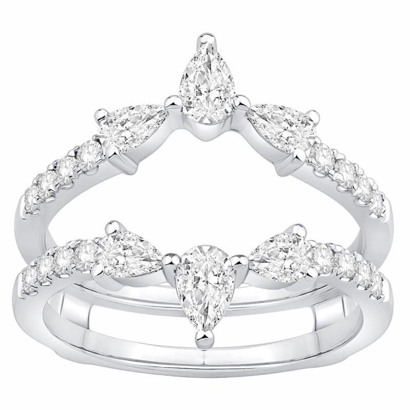 Ladies diamond ring guard in 14 karat white gold. Set in the ring guard are eight round brilliant cut diamonds and two pear cut diamonds with a total weight of 0.75 carat.