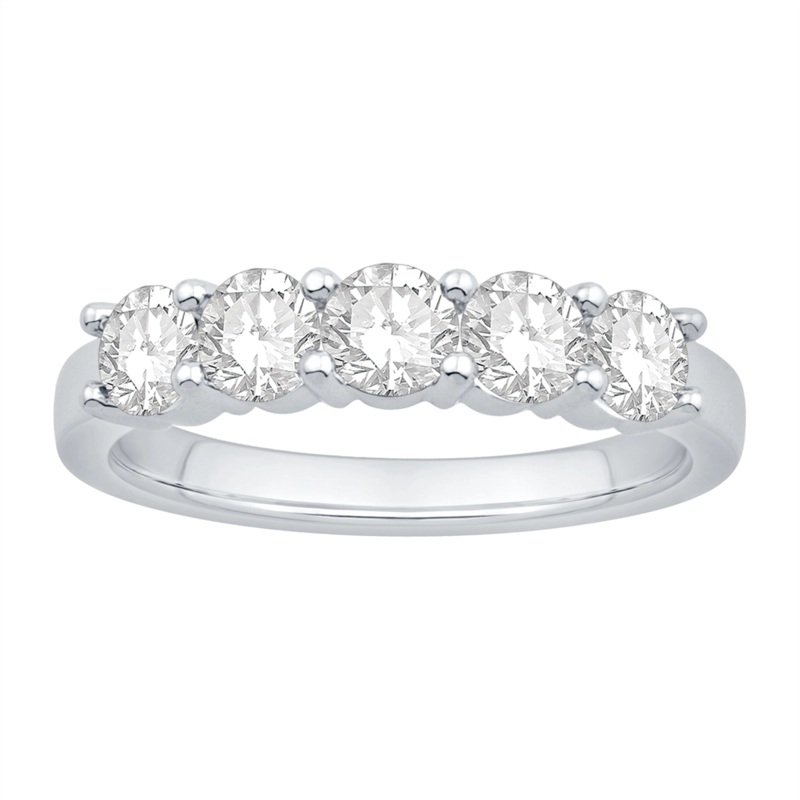Ladies diamond band in 14 karat white gold. Set in the band are five round brilliant cut diamonds with a total weight of 1.00 carat.