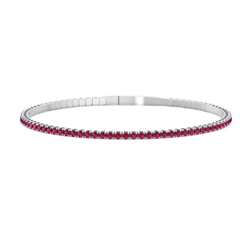 Ladies ruby bracelet in 14 karat white gold. Set in the flex bangle bracelet are round rubies.
