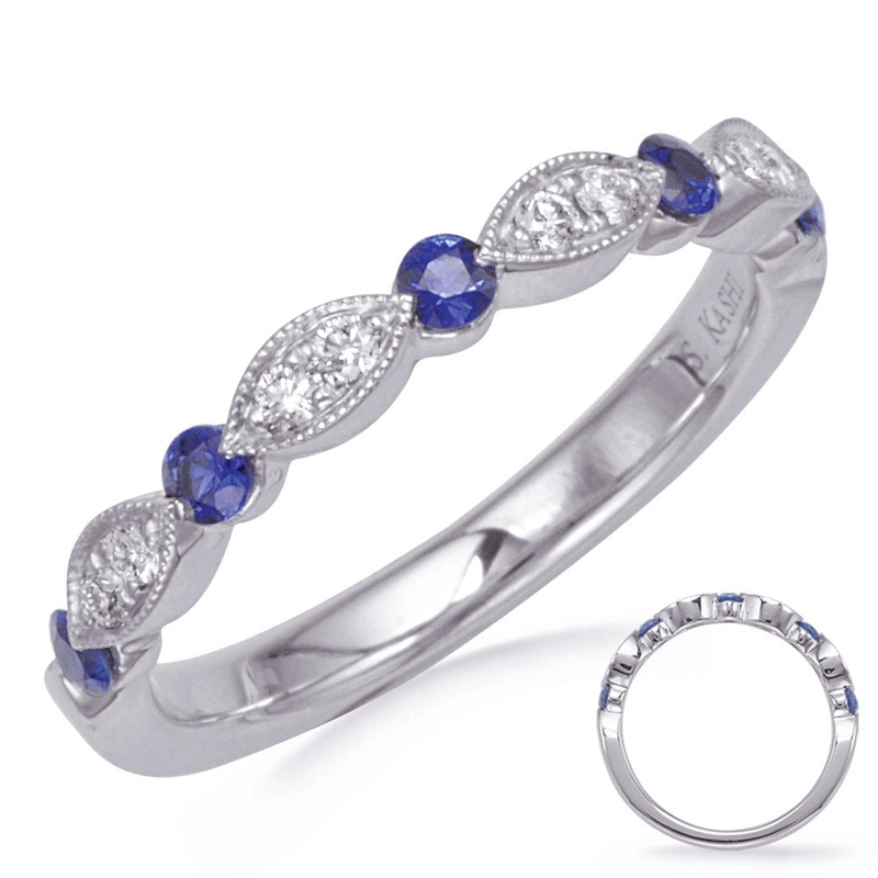 Ladies sapphire and diamond band in 14 karat white gold. Set in the fancy band are five round cut blue sapphires with a total weight of 0.28 carat and eight round brilliant cut diamonds with a total weight of 0.10 carat.