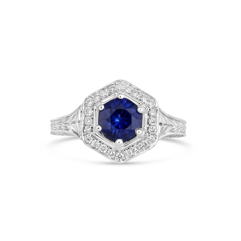 Ladies sapphire and diamond ring in 14 karat white gold. Set in the ring is one 0.91 carat round blue sapphire and 24 round brilliant cut diamonds with a total weight of 0.14 carat.