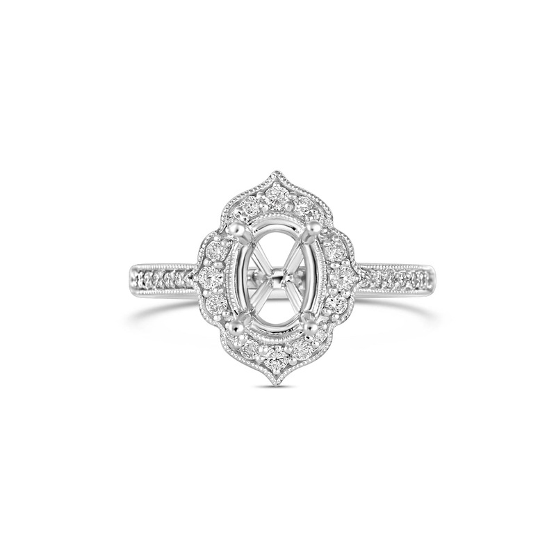 Be the first to review “14K White Gold Semi Mount, For Oval Diamond, Fancy Halo, Beaded Edges”