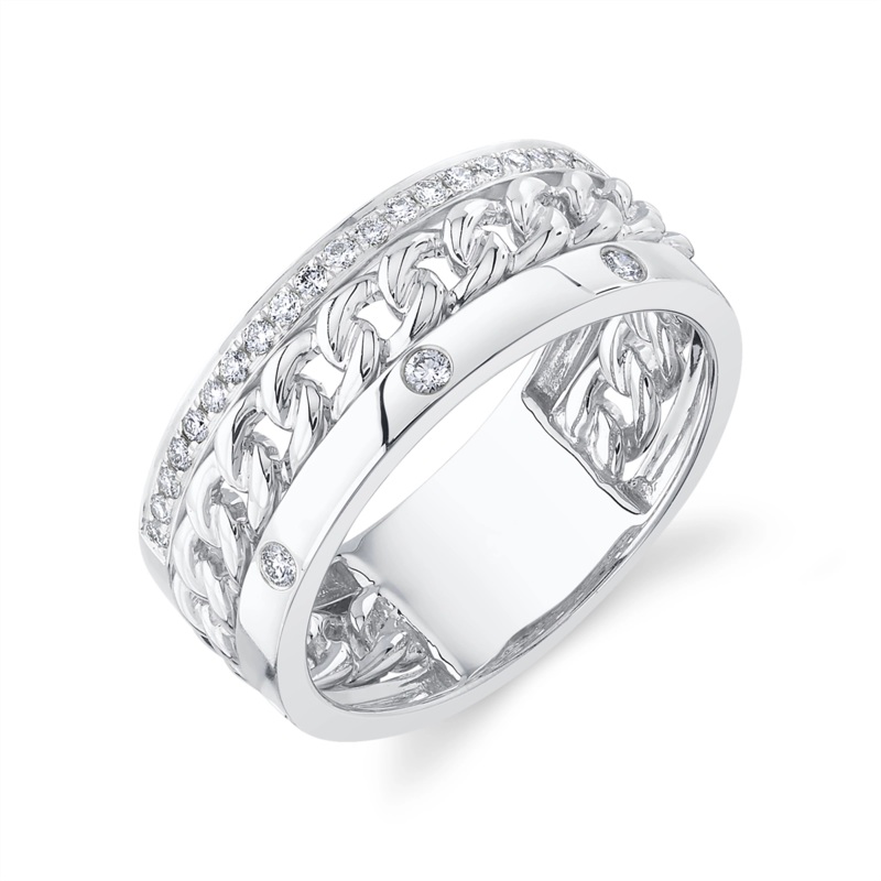 Ladies diamond ring in 14 karat white gold. Set in the faux stack ring are 23 round brilliant cut diamonds with a total weight of 0.27 carat. *Ring has a sizing bar