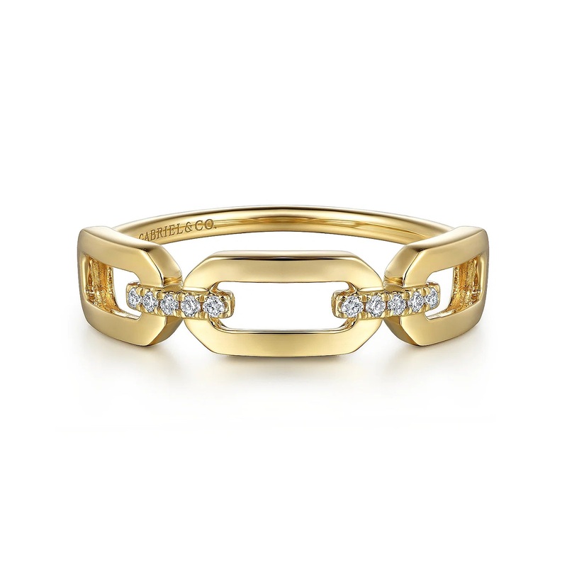 This classic 14K yellow gold chain link ring is the perfect combination of sophisticated style and luxury. Its timeless, diamond-encrusted design makes it an ideal choice for special occasions or everyday wear. The 0.04ctw diamond accents add a subtle, elegant sparkle, making any look stand out.